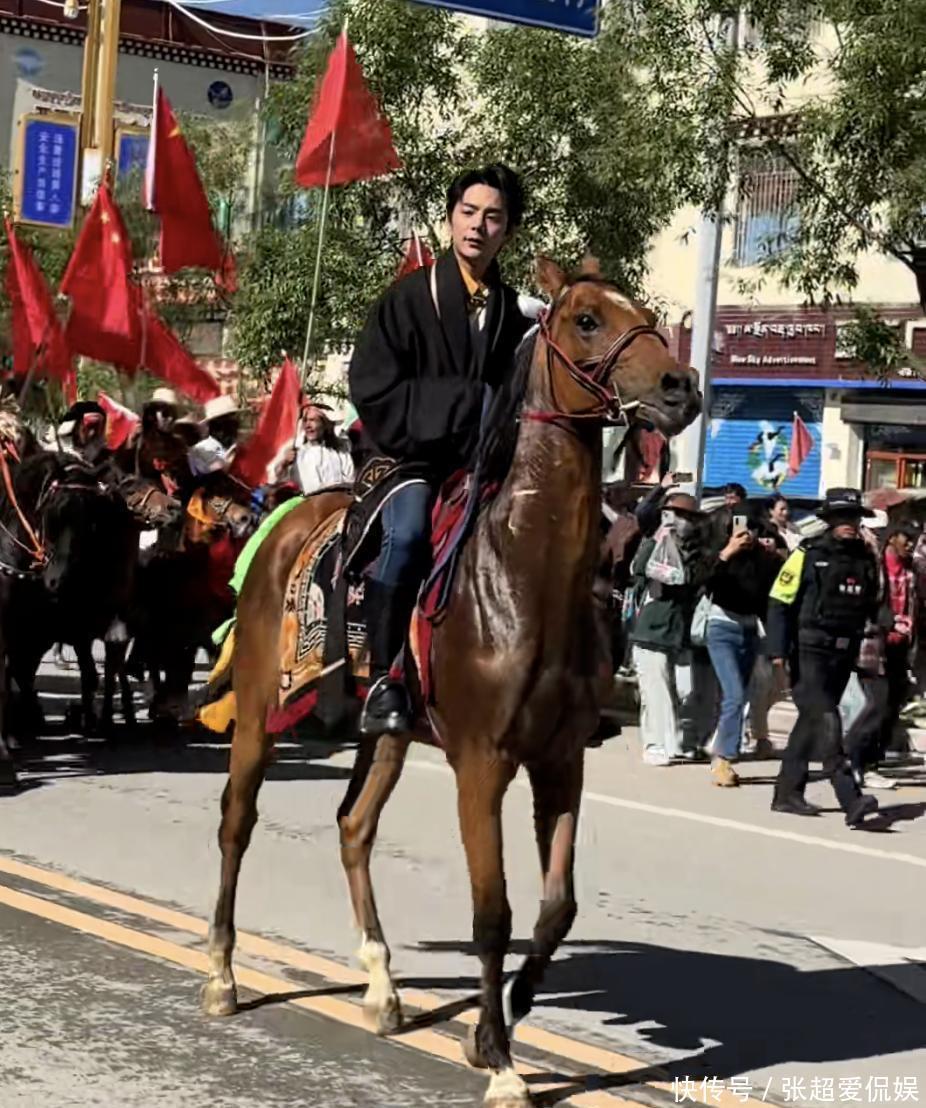 今年七月他回家乡参加活动,他骑着高马驰骋在前方,身后一排人举着旗帜骑着骏马跟着,周围全是喝彩欢呼的人群,他像个王子一样,矜贵清隽、少年感溢屏。网友调侃:回到高原就变成高原草子,一下山就像个新兵蛋子。